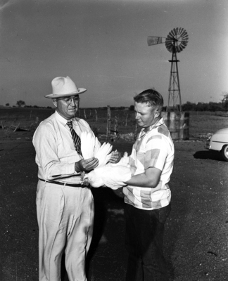 Series on Carl Grubb and S. L. Adams Gatesville vocational agriculture teacher. Carl Grubb examines one of the hybrid chickens which is a part of the boy's diversified Future Farmers of America program.
