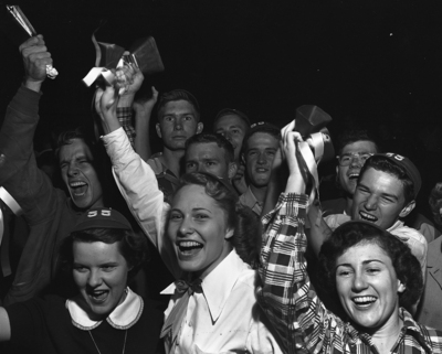Schools. TCU. General. TCU freshmen at campus pep rally, front left to right, Elaine Ellzey, Joan Balajka, and Georgia Collins, rear left to right, Arthur Budge, K. W. Kirkpatrick, Dick Thomas, George Hill, and Austin Band.