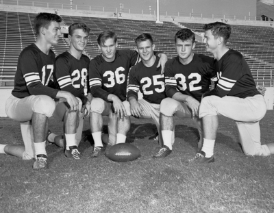 Here are six football players for Texas A&M lined up at Texas Christian University. Left to right, Ray Graves, Yale Lary, Bob Smith, Glenn Lippman, Billy Tidwell and Dick Gardemal. Published in Fort Worth Star-Telegram morning edition, October 20, 1951.
