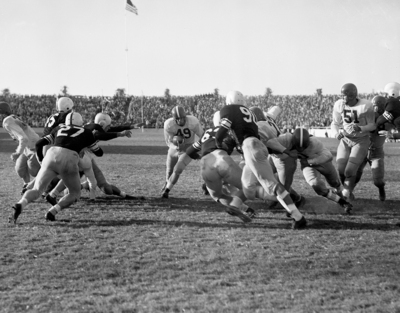 Ray McKown (49) will be trying to duplicate feats like this when Texas Christian University goes against Baylor. Here, he finds wide hole in Texas A & M line and romps across for touchdown. Published in Fort Worth Star-Telegram morning edition, November 3, 1951.