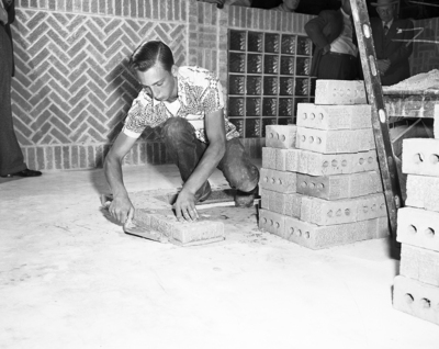 Image of Billy Brammer, champion brick layer, wearing a collared shirt and kneeling down to spread masc for a brick base.
