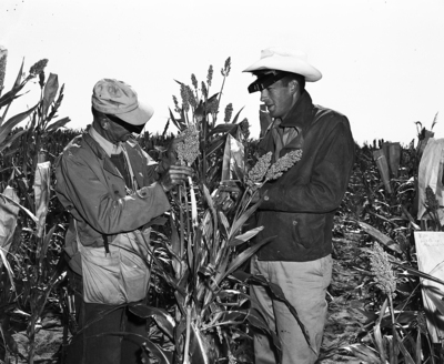 Series on the Chillicothe Experiment Station. Joe Stephen, left, and Dick Holland agronomists at Chillicothe station, are shown here explaining grain sorghum heads which they capped in work development hybrid sorghum.