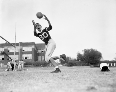 Charles Greenslade is shown catching the ball during a football game. He is wearing the number 80 uniform.