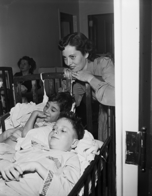 City County Hospital polio ward, John Wayne Wise, Raymond Linn Allman, and Mrs. J. W. Wise. Patients watching movies in the hallway.