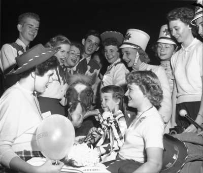Arlington High School "Little Arlie" Shetland mascot with (front, left to right) Lyndal Patsy Kelly, Pamela Workman, Sue Roberson (back, left to right) Carol Ryan, Dianne Jackson, Darrell Stewart, Mary Ann Smith, Shirley Hoffman, Bonnie Jo Black and Shirley Hoyt.