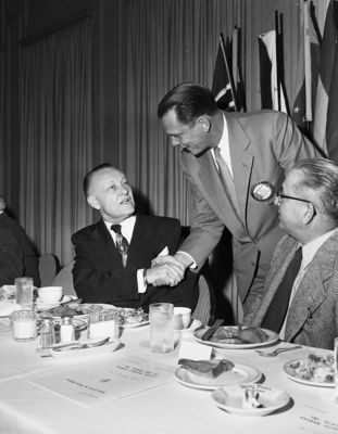 Civil Aeronautics Board, Josh Lee, left, member of the Civil Aeronautics Board and former U. S. senator for Oklahoma, shakes hands with Joe Evans, president of the Fort Worth Rotary Club, with Will Ed Kemble, right.