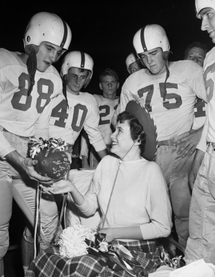 Patsy Kelly, 16-year-old Arlington High School Senior, and a polio patient, receives autographed football used in the Diamond Hill game last week.
