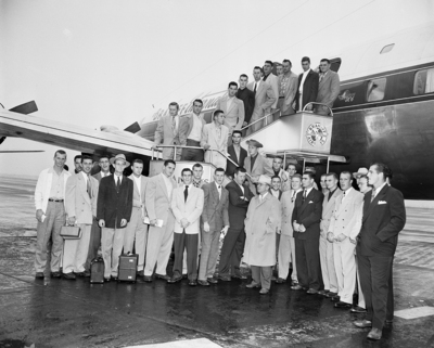 Coach Leo R., Meyer, in Western hat and top coat, at center, herds his Frogs aboard plane for trip to Los Angeles to play a game with Southern California. Left to right are Bob Blair, Trainer Elmer Brown, Tommy Moorman, John Harville, Marshall Robinson, Eddie Wilburn, Ray McKown, Douglas Conaway. Meyer, Bob McEachern, and Don Martin. Published in Fort Worth Star-Telegram evening edition October 26, 1951.