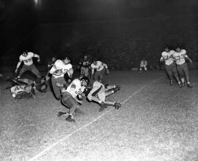 Bryan Honts, Arlington Heights back, comes to the end of a 4-yard gain against North Side at Farrington Field. Making the tackle is the Steers' Billy Spruill. The Yellowjacket in the foreground is Gene Beveridge. Published in Fort Worth Star-Telegram morning edition October 27, 1951.