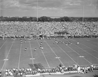 Baylor's Larry Isbell finds his favorite target Stan Williams, with an 11-yard pass in the first quarter at College Station. Note the protection given the passer by the Bears and also the defensive "umbrella" thrown up by the Aggie secondary. Isbell hit on 14 passes in 21-21 thriller. Published in Fort Worth Star-Telegram morning edition October 28, 1951.