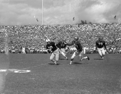 Texas A&M's Yale Lary tries unsuccessfully to evade grasp of Baylor's Ronald Black (82) as Bears' Gale Galloway comes up from rear to assist on tackle. Published in Fort Worth Star-Telegram evening edition November 24, 1951.