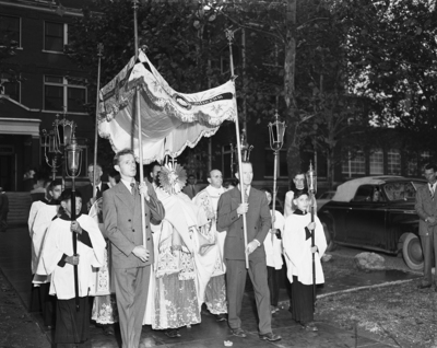 Catholic Church. OLV. Reverend Lawrence DeFalco shown carrying Blessed Sacrament in the Christ the King procession at OLV.