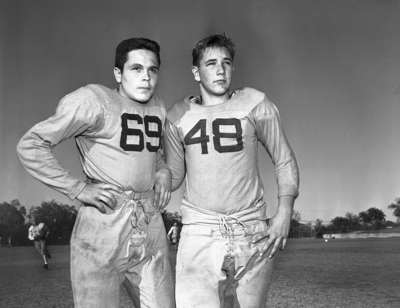 Wearing the uniforms number 69 and 48 are Barney Smith, left, and George Scymgeour. They are both part of the football team for J. P. Elder, Jr. High. Published in Fort Worth Star-Telegram evening edition November 2, 1951.