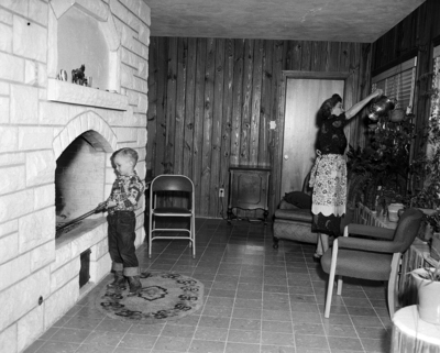 A big help in the more than 5,000 square foot of living space in the Verner R. Shurmon home at Pantego is young Richard Stahl, of 2417 Forrest. Richard strokes the fire in one of the two fireplaces while Mrs. Joyce Edith Shurmon waters the house plants by the other side of the room. Published in Fort Worth Star-Telegram evening edition March 6, 1950.