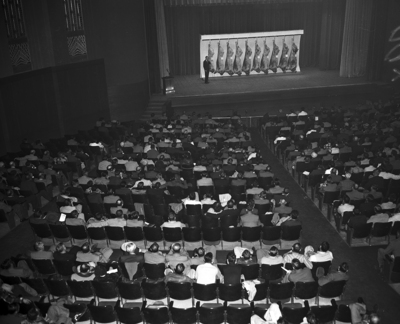 Ed Bealke, head of Swift & Company's beef, lamb and veal; division here, uses carcasses to demonstrate grades and classes to an alternative audience at the 2nd annual Texas Livestock Roundup in Will Rogers Auditorium.