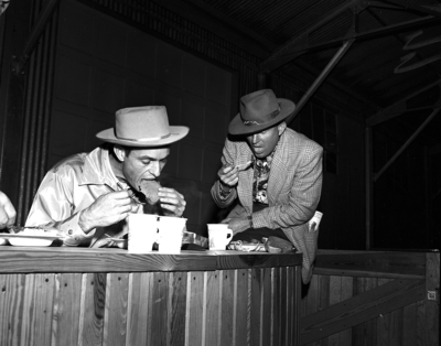 Southwestern cattlemen gathered at Will Rogers Memorial grounds to talk about and hear about cattle. Stanley Lafon of Telephone, left, and D. H. Hamilton of Ivanhoe go for a bite of chow.