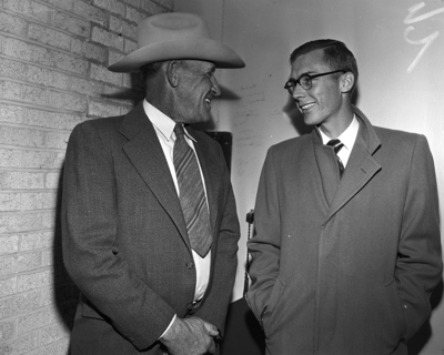 Southwestern cattlemen gathered at Will Rogers Memorial grounds to talk about and hear about cattle. L. D. Boone of Seymour and Ted St. Clair of Ranger like what they see of the roundup.