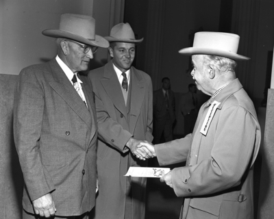 Carter Taylor, right, member of the reception committee, welcomes C. M. Caraway of Deleon, left, and F. W. Smith of Lampasas, center, to the second annual Texas Livestock Roundup in Will Rogers Memorial Auditorium.