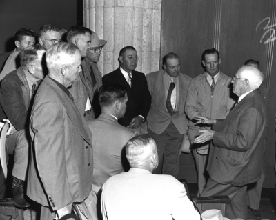 When the Livestock Roundup had recess at Will Rogers Memorial Auditorium, D. Howard Doane, founder of the famed Doane Agricultural Service of St. Louis, found himself surrounded by eager questioners. Doane answered many questions on livestock management and trends in addition to appearing on the program.