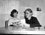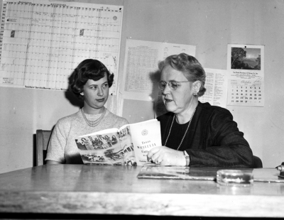 Miss Ernal Smith, right, director of religious activities at Texas Women's College, is assisting her niece, Miss Sue Smith, TWC sophomore from Morton, plan her campus activities. Miss Smith is the daughter of Mr. and Mrs. W. W. Smith of Morton.