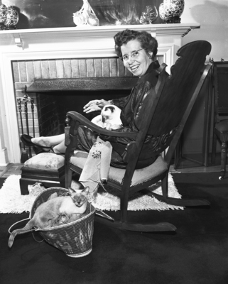 The old rocking chair's got Dolly all right, but it probably wishes it hadn't. You will go a long way to find another rocking chair case like this one. With friends (and photographers) dropping in all the time, and two Siamese beauties clambering all over, Dolly Barmann just barely has time to tend to her knitting. The doctor says she is almost as good as new now.
