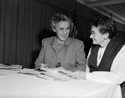 Mrs. Mary S. Switzer of Buffalo, left, outgoing president of the National Home Demonstration Agents Association, is shown conferring in Fort Worth with the group's president-elect, Mrs. Carmen Johnson of Fort Collins, Colorado, on the association's national convention.