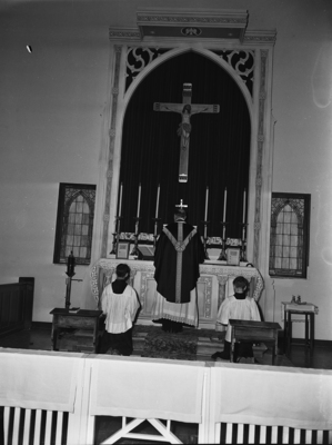 Shown in the picture is a new altar, built by parishioners' donations, at St. Alice Catholic Church, 5600 Camp Bowie Blvd. Earnest Langenhorst, pastor and altar boys are pictured.