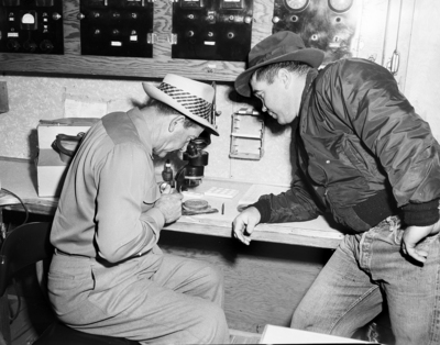 At World's Deepest Test- J. R. Jackson, left, Fort Stockton, tool pusher for Phillips Petroleum Company checks samples from the No. 1-EE University, section 7,block 24, University Land, the world's deepest hole. Looking on is Joe Midkiff, who is logging the project for Trans-Pecos Engineering Company, Midland, Texas.