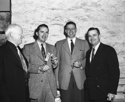 Participants in centennial celebration for old Fort Belknap in Young County. Four men who took time out for a cigar, left to right, State Senator George Moffett of Chillicothe, Governor Shivers, Congressman Frank Ikard of Wichita Falls and Federal Judge James V. Allred of Corpus Christi, a former governor.