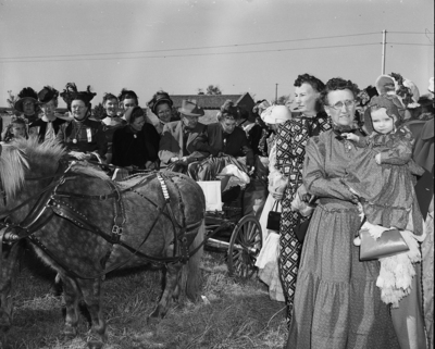 Ben G. Oneal of Wichita Falls, president of the Fort Belknap Society, watches as his wife rearranges the 75-year-old hoops which she wore as part of her pioneer dress. The couple later joined parade line with their pony cart.