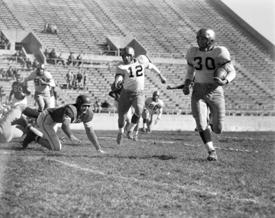 Carswell's Jim Jeffrey starts on a 48-yard scoring run against McMurry at Farrington Field. Trailing him is W. C. Cooper, the Bombers' quarterback. Carswell won the game, 61-12. Published in Fort Worth Star-Telegram morning edition November 4, 1951.