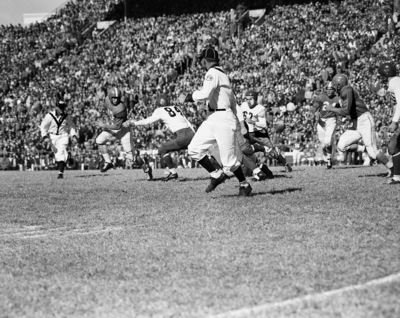 Bill Rippey (84), Southern Methodist end, moves in to bring Gib Dawson, Texas back, down for a 3-yard loss in game at Cotton Bowl. Published in Fort Worth Star-Telegram morning edition November 5, 1951.