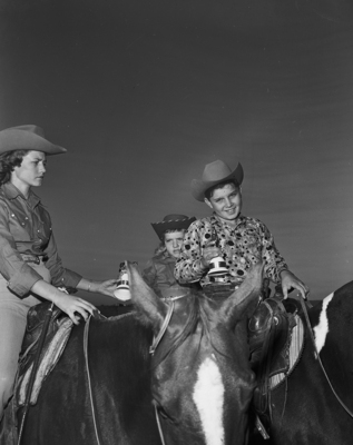 Joy, Jan and Joe Combs, left to right, fondle some of the trophies they carried back to Montague County after the horse show; They won five first places.