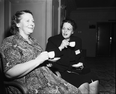 Delegates from all sections of the nation are here for the National Home Demonstration Agents Association convention. Here Marian Weaver, left, of Knox, Indiana, chats with Mary Thompson of Tuskegee, Alabama.