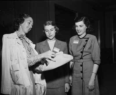 Mrs. Tom Joyce Cunningham of Breckenridge, left, member of the hostess committee for the National Home Demonstration Agents Association convention here, shows Elaine Wendler, center, of Edwardsville, Illinois, and Ruth Slayton of Canton, Illinois, how to crease a Western hat.