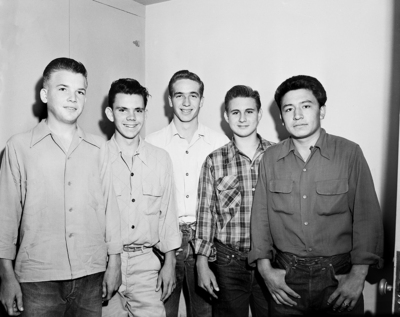 Shown are Junior High Football players. They are left to right; Kenneth Dean, from Rosemont Junior High, Robert Lay, from Daggett Junior High, John Howington, from Rosemont Junior High, Bill Carter, from Daggett Junior High, and Xavier Leza, from Rosemont. Published in Fort Worth Star-Telegram evening edition November 6, 1951.