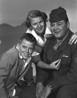 Sgt. James Ogletree, right, 20-year-old Lena Pope Home boy who returned lat week from Korea after almost 14 months duty with the 1st Marine Division there, tells about his ribbons while visiting his brother, Furman Ogletree, 13, left, and his sister, Marvelle Ogletree, 15, at the home.