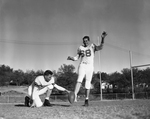 Poly's Robert Young practices bare-foot place-kicking in preparation for the game with Carter, in which he will do the kicking off, without a shoe, yet. Holder is Robert Purnell. Published in Fort Worth Star-Telegram evening edition November 9, 1951.