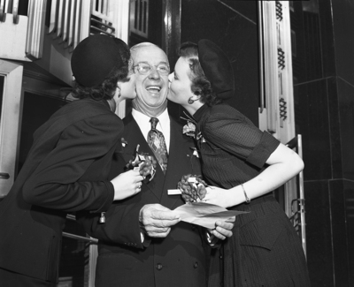 Mayor Edwards is shown making a pre-kickoff purchase of Veterans of Foreign Wars poppies held by Misses Sandra Ann Hobbs of Texas Christian University, left, and Diana Tyer of TWC.