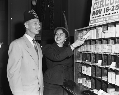 Mrs. W. D. Brandon, 3903 Westridge, had her choice of an entire coliseum when she bought the first dozen tickets to the Shriner Circus in Will Rogers Memorial Coliseum. She bought tickets from George Barton, in charge of advance sales booth in Hotel Texas lobby. First day sales ran 100 percent ahead of last year's initial day.