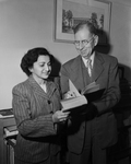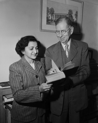 Dr. L. R. Elliott, Librarian at Southwestern Baptist Theological Seminary, shows Miss Eunice de Souza of Brazil, student and library staff member, a book he purchased in England for the library. Miss de Souza's father, Rev. S. A. de Souza, is a Baptist minister at Rio de Janerio.