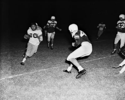 Tommy Runnels, North Side's busy tailback, ends 12-yard against Tech as Charles Greenslade pulls him down from arrears. Runnels gained 162 yards on 26 carriers. Published in Fort Worth Star-Telegram evening edition November 9, 1951.