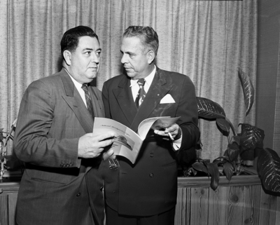 Charley Treuter (left), chairman of the American Bowling Congress (ABC) tournament site committee, and Cliff Galloway, secretary of the Fort Worth Bowling Association, look over plans for holding the ABC meet here in 1954. Treuter and other ABC officials inspected Fort Worth's facilities. Published in Fort Worth Star-Telegram morning edition November 9, 1951.
