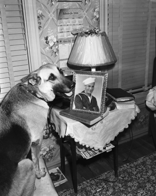 "Lady" shown looking at picture of her master, Edwin Mitchell, who died recently.