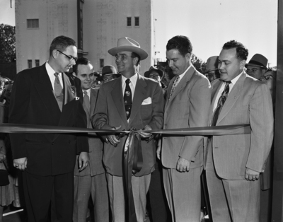 Berl E. Godfrey, Fort Worth Chamber of Commerce president, cut the ribbon to open officially Fort Worth's fourth Western Auto Store at 3032 Hemphill. Left to right are John W. Briscoe, divisional promotional manager, Godfrey, W. H., store manager, and Tony Nahkunst, retail sales manager of the Dallas division.
