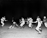 Carter-Riverside's Boyd Dollar goes down on Poly's one-yard line after taking pass from Burdette Warner. Eagles scored lone touchdown on next play. Poly defender at right is Paul Wilson. Poly won 18-6. Published in Fort Worth Star-Telegram morning edition November 10, 1951.