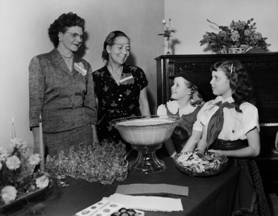 Marylin Ruth Clark, third from left, and Judith Karen Davis were among the members of the Camp Fire Girls who entertained their mothers at recent mother-daughter teas. Mrs. Opal L. Davis, left, and Mrs. Charles E. Clark , were guests at the North Side District tea given at Lake Worth Methodist Church.