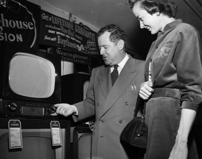 Mrs. H. S. Huffman, 3237 Winsgate, is shown as she shopped for a television set that will be a Christmas gift. The salesman is Harry Rooke, 3832 Winslow Drive.