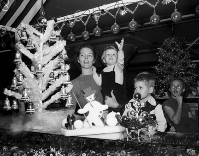 Two-year-old Michele squeals with delight and reaches for a Christmas bauble as her mother, Mrs. O. C. Fry, 2809 Princeton, begins her Yule shopping tour. At right is Mrs. Frye's son, Stevie, 4.