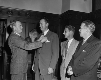 Charles R. Speers, assistant vice president and general sales manager of American Airlines, sticks a 10-year service pin in the lapel of Milton A. Atkinson Jr., American's Fort Worth sales manager. Watching, left to right, are Elmo Coon, regional director of sales, and Dall D. Deweese, regional manager of cargo sales.